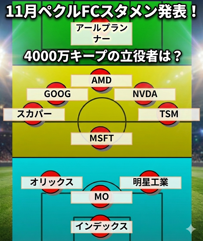 私は自分のポートフォリオを**「ペクルFC」というサッカーチームのフォーメーション**に見立てて管理しています。 その視点で今月を振り返ります。