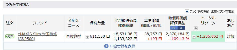 当時の旧つみたてNISAを2年ほど続け、投資元本は85万円程度でした。 2022年当時は含み益も数%にとどまっていましたが、そのまま毎月33,333円の積立を継続し(2023年末の制度終了)、結果2024年6月時点では円安と株高の恩恵も相まって「+70%」ほどの含み益に成長していました。